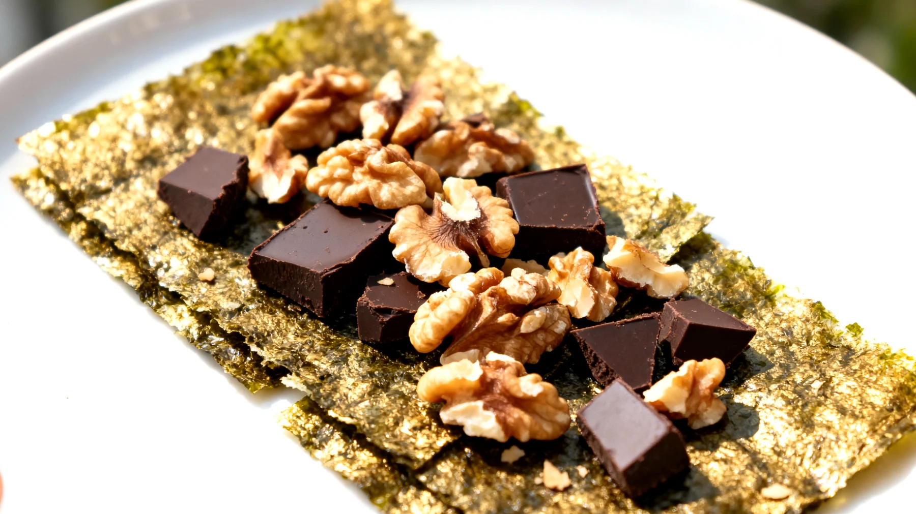 Was macht diese Kombination geschmacklich so interessant? Nori bringt eine maritime Umami-Note mit, die durch Glutaminsäure entsteht. Walnüsse steuern Bitterkeit und cremige Textur bei, während dunkle Schokolade beide Geschmacksrichtungen mit ihrer eigenen Komplexität aus Süße, Bitterkeit und fruchtigen Noten verbindet. Diese Balance aktiviert unterschiedliche Geschmacksrezeptoren und macht den Snack deutlich befriedigender als eindimensionale Süßigkeiten.
